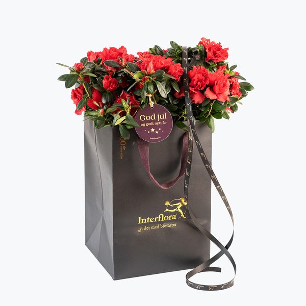 Nydelig rød Asalea i stor størrelse, levert i Interfloras eksklusive gavepose (leveres uten potte). En av våre mest populære juleplanter, et godt valg til både gammel og ung.